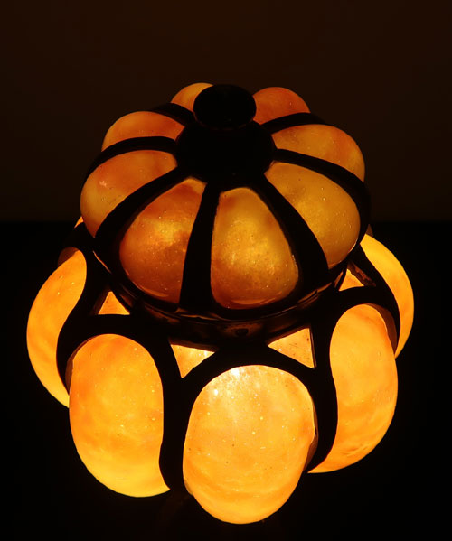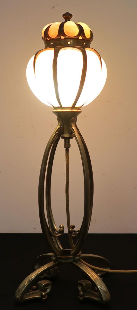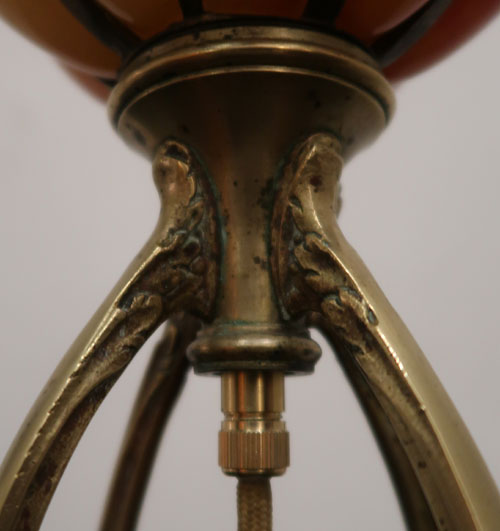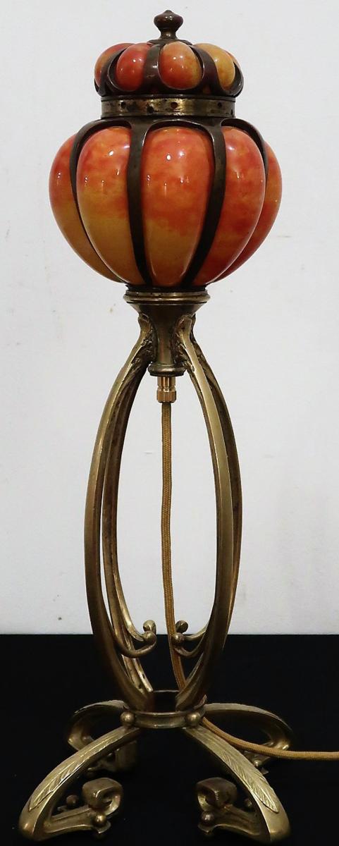 Zum Verkauf steht eine absolute Rarität; eine traumhaft schöne Tischlampe aus dem französischem Jugendstil. Dieses Modell erinnert stark an Entwürfe von Andre Delatte oder Charles Schneider. Diese neu elektrifizierte Leuchte erstrahlt in einem warmen und harmonischen Licht. Ein verziertes Messinggestell trägt ein farbigen mit Einschmelzungen versehenden Glasschirm, eingeblasen in ein Metallkorpus. Eine sammelwürdige Rarität.