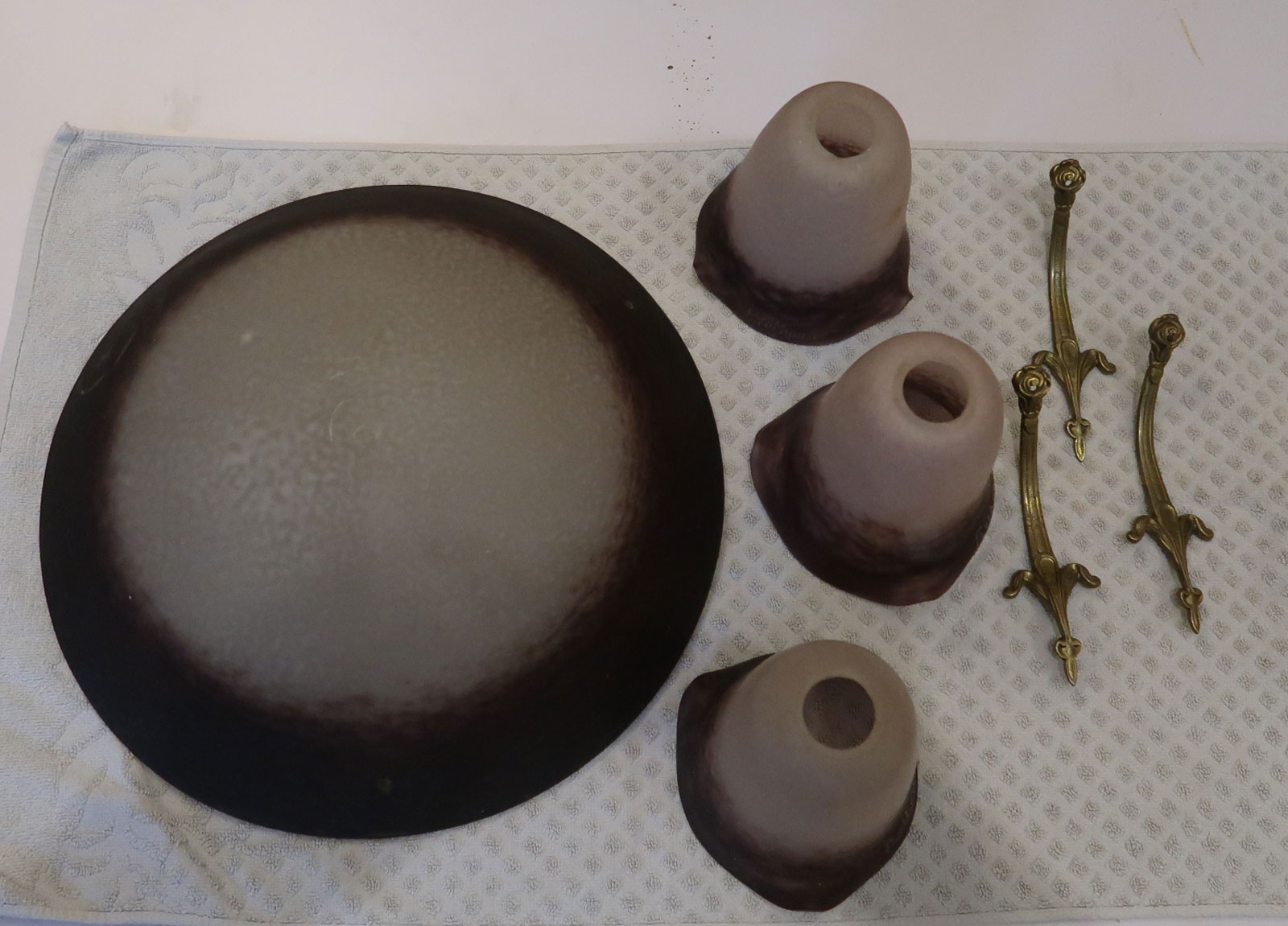 Zum Verkauf stehen die Gläser und Metallteile zur Herstellung einer antiken, signierten Deckenlampe der Region Rethondes. Aus innerbetrieblichen Gründen ist eine eigene Restauration zeitnah nicht möglich.