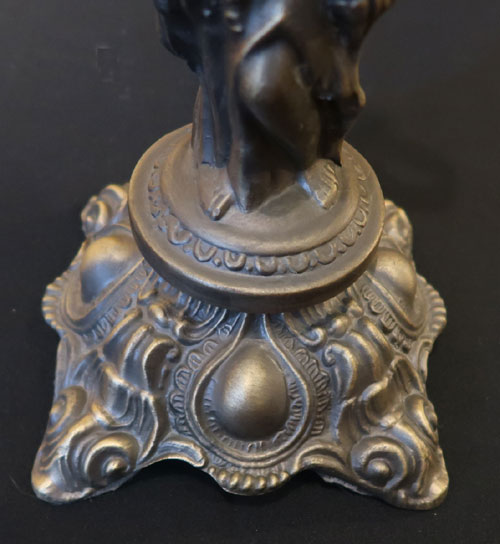Zum Verkauf steht ein elektrifizierter Lampenfuss aus einer Metall-Legierung; dieses 2flammige Gestell hat das Motiv einer Frau mit Krug.