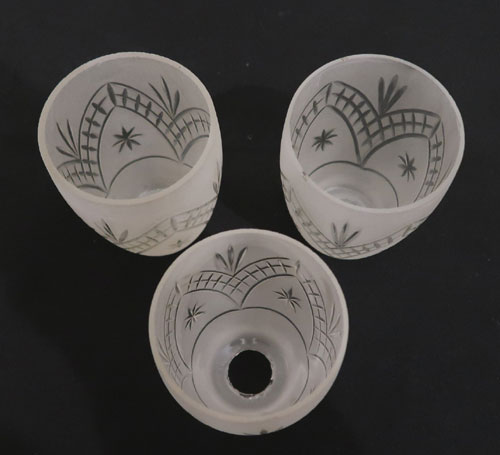 Zum Verkauf stehen alte Sternschliff-Glasschirme in sehr gutem originalem Zustand. Lampengläaser sind mit einer Ø 28mm Bohrung versehen. Einzeln oder als 3er Setfür Deckenlampen: immer eine exclusive Schirmbestückung für Ihre Leuchten. Leichte Gebrauchsspuren sind vorhanden und sind bei alten Glasschirmen als normal zu betrachten