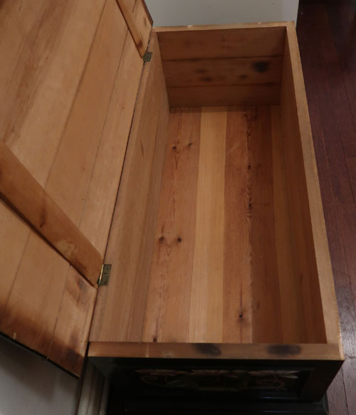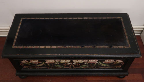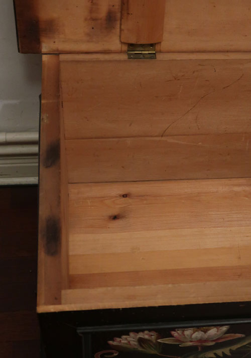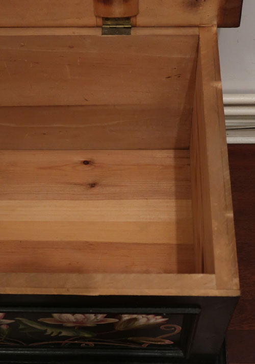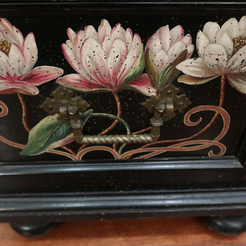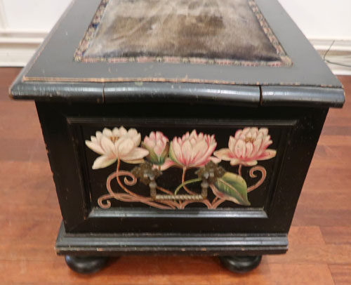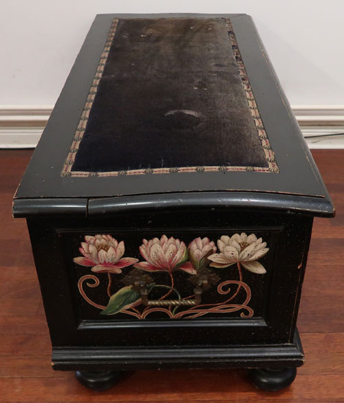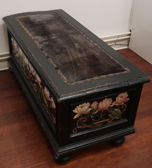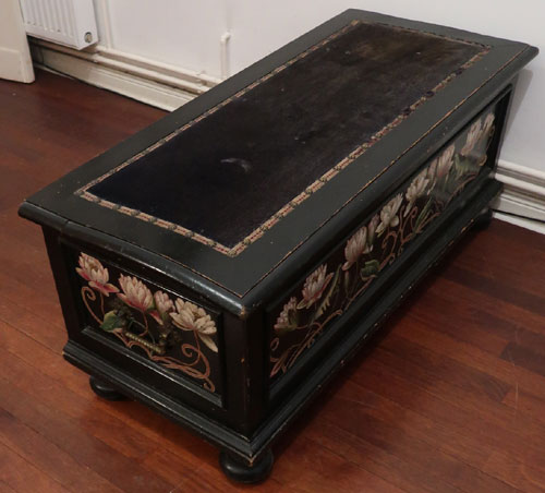 Zum Verkauf steht eine handbemalte Deckeltruhe aus dem Jugendstil. Der Glattdeckel ist mit Samt bezogen und weist einige leichte Gebrauchsspuren auf. Der Korpus hat Spuren vom nicht aktiven Holzwurm und ist mit wunderschönen Blumenmotiven bemalt ( Seerosen ? )