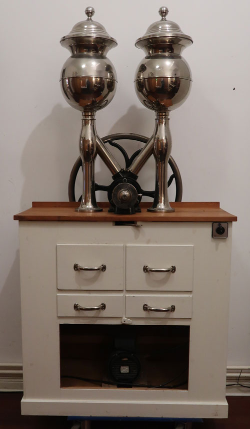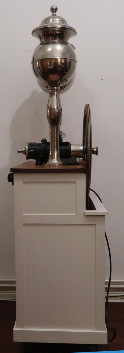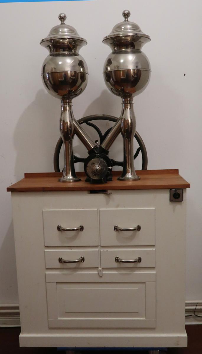Zum Verkauf steht eine voll funktionsfähige und seltene Standkaffeemühle. Diese Mühle, zur Jahrhundertwende in Dänemark gebaut, wird durch einen Elektromotor angetrieben ( Kraftstrom ). Der Holzkorpus ist weiss gestrichen und trägt das Mahlwerk mit 2 Trichtern zur Befüllung mit Kaffeebohnen sowie 4 Schübe, die mit Blech ausgekleidet sind um den Kaffeegeschmack nicht zu verfälschen. Die Mühle ist voll funktionsfähig.