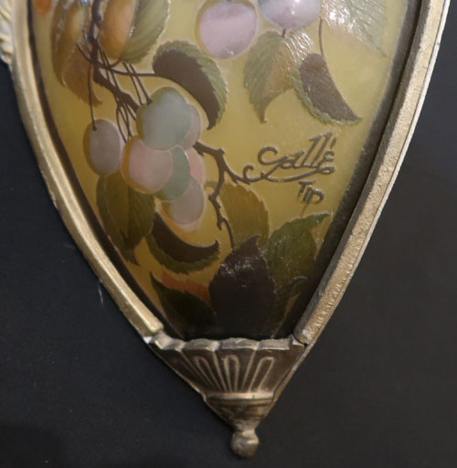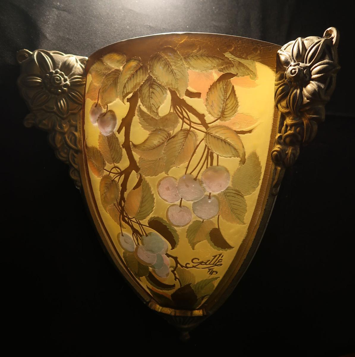 Zum Verkauf steht eine absolute Rarität. Eine hochwertige Replika einer Eckwandlampe nach Motiven und in der Herstellung nach Emile Gallé. Die extrem hohe Glasqualität zeigt sich insbesondere in beleuchtetem Zustand. Das Gestell ist derzeit nicht elektrifiziert und wurde nach originalen Vorbild gefertigt. Diese ausgesuchten Stücke wurde vor mehr als 30 Jahren gefertigt; leider verhinderte der hohe Herstellungspreis eine kleine Serienfertigung. Diese Eckwandlampe zeigt als traumhaft schönes Motiv einen Zweig mit Kirschen. Eine exclusive sammelwürdige Rarität.