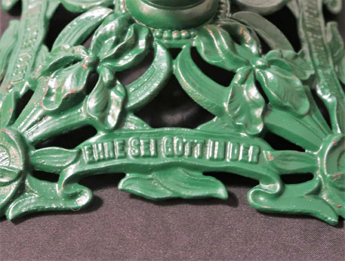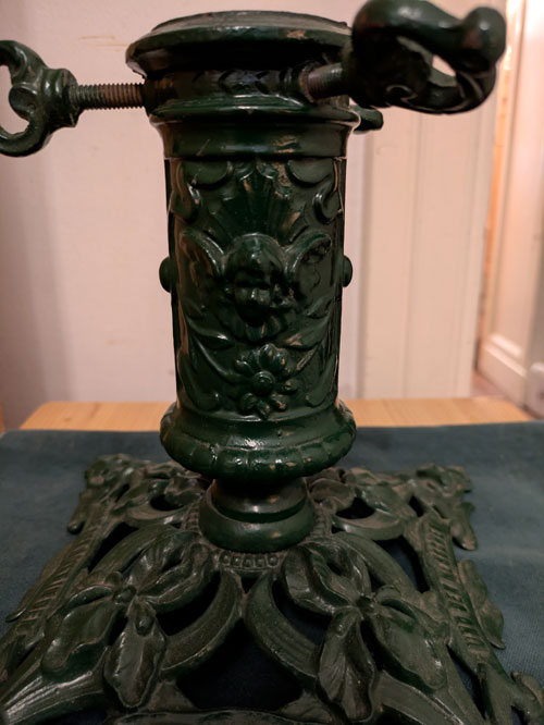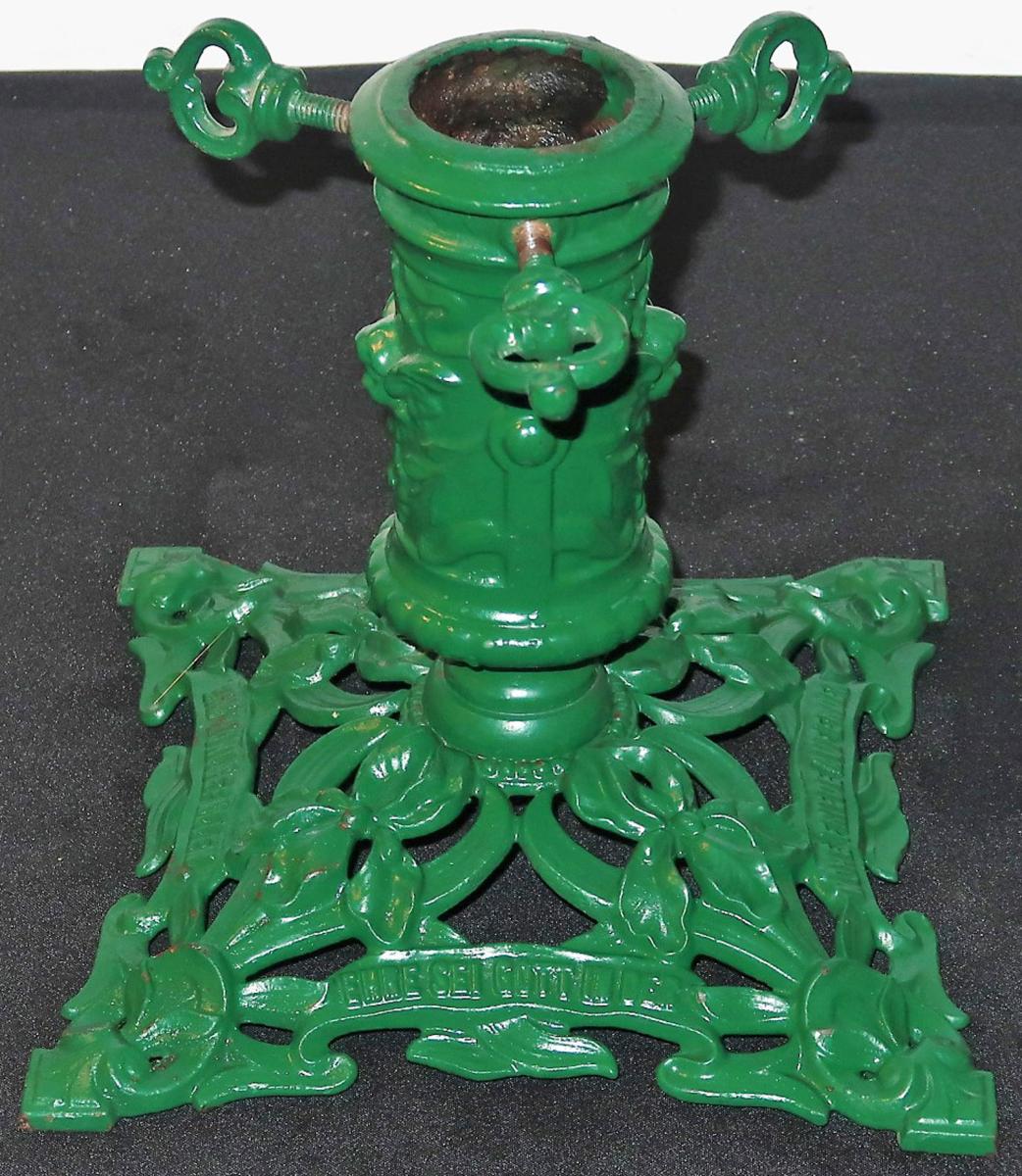 Zum Verkauf steht ein bestens erhaltener alter Weihnachtsbaumständer aus Gusseisen. Der hochwertig verarbeitete Ständer ist grün lackiert und weist neben Engelmotiven eine umlaufende Inschrift auf.