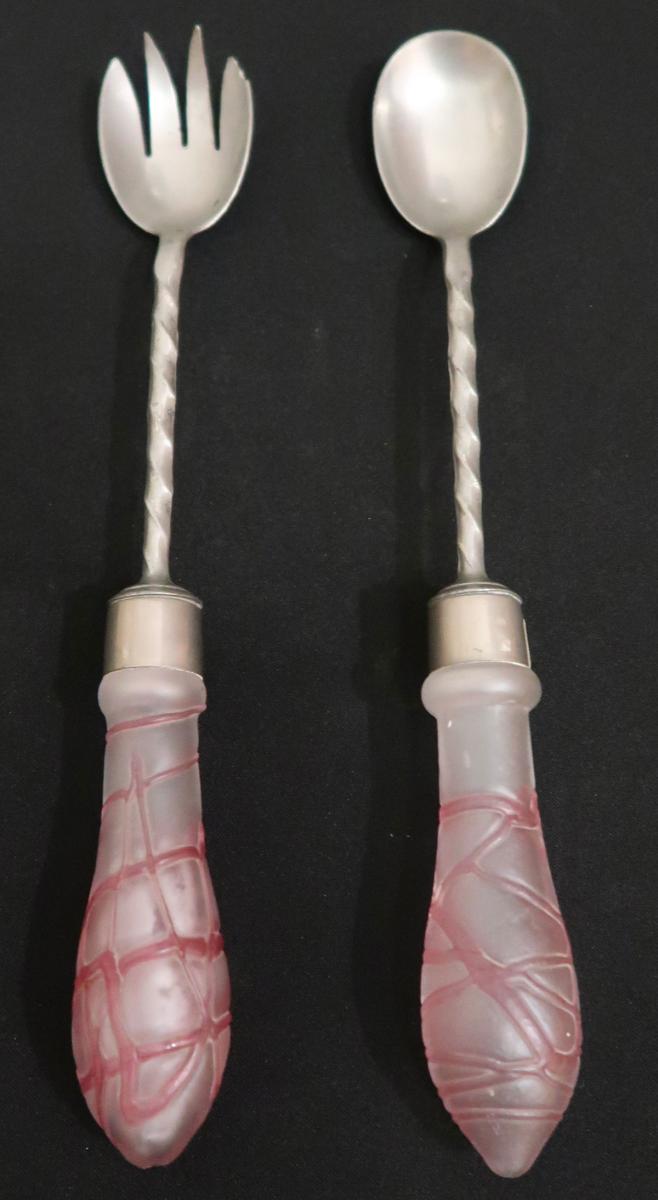 Zu Verkauf steht ein 2er Set Salat-Besteck aus dem Art Deko. Die versilberten Besteckteile haben kunstvoll gestaltete Griffe aus mattiertem Glas.