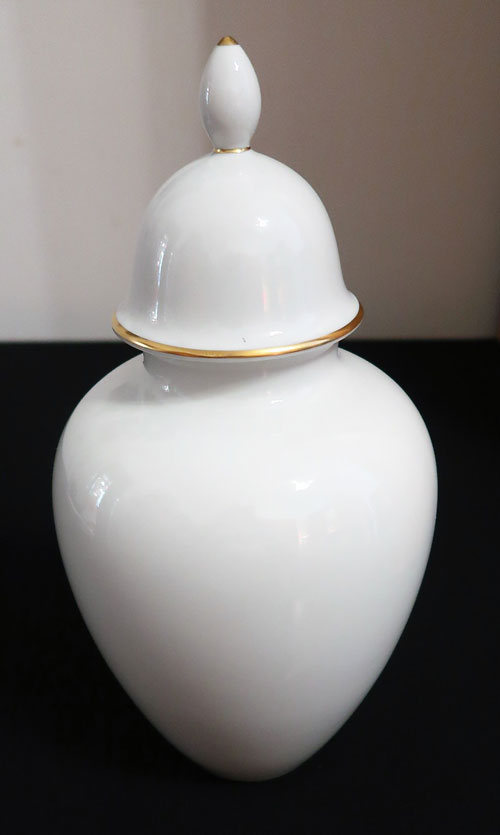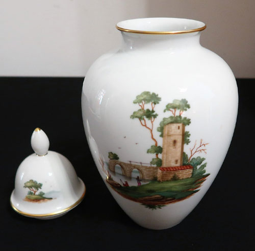 Zum Verkauf steht eine Deckelvase aus der Manufaktur Hoechst. Die bauchige Vasenform ist mit einem Burgmotiv versehen. Das edle Stück ist ohne Beschädigungen und sofort aufstellbar.