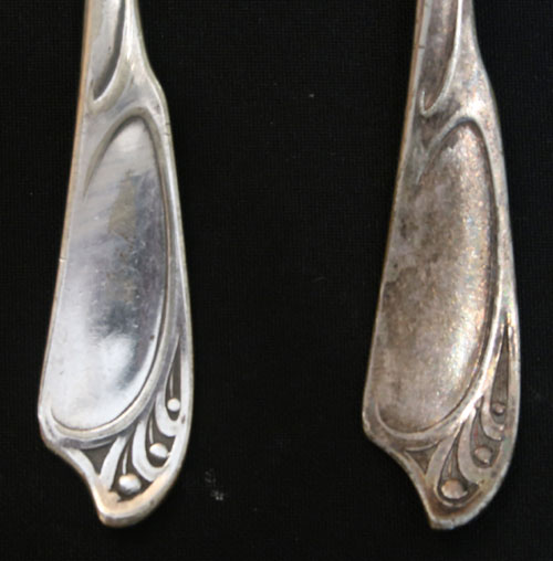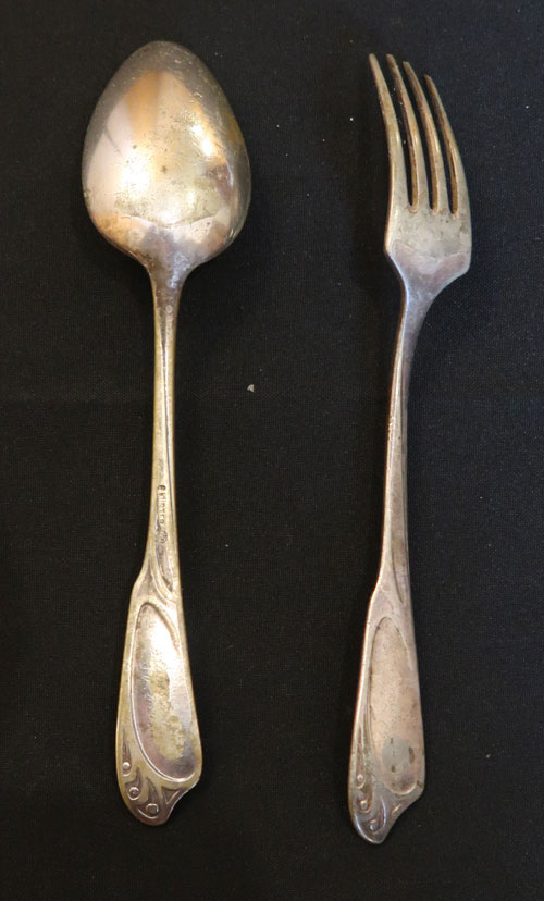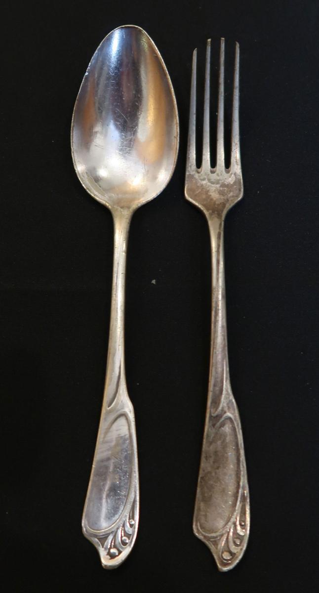 Zum Verkauf steht eine Gabel und ein Löffel. Ein Hersteller ist uns nicht bekannt; beide Teile stammen aus dem Jugendstil und sind zumindest versilbert. Besteckteile sind leicht zu reinigen ( Auskunft Juwelier, nicht unser Spezialgebiet ).