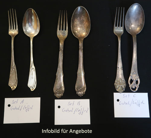 Zum Verkauf steht eine Gabel und ein Löffel. Ein Hersteller ist uns nicht bekannt; beide Teile stammen aus dem Jugendstil und sind zumindest versilbert. Besteckteile sind leicht zu reinigen ( Auskunft Juwelier, nicht unser Spezialgebiet ).