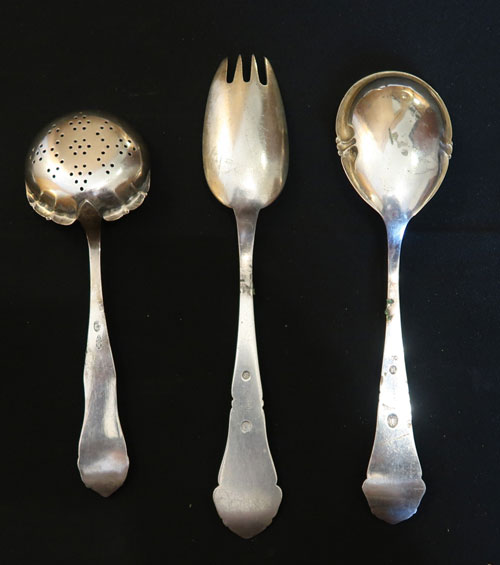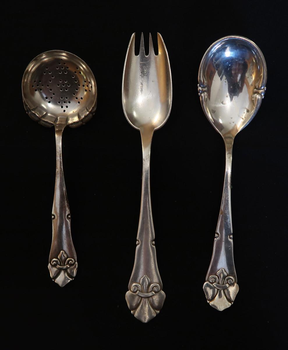 Zum Verkauf steht ein 3er Set von Vorlegeteilen für den gedeckten Tisch. Diese versilberten Teile haben verschiedene Punzen und Stempel und sind mit der französischen Lilie verziert. Alle Teile weisen Gebrauchsspuren auf; sind aber eine Bereicherung für die Tafel.